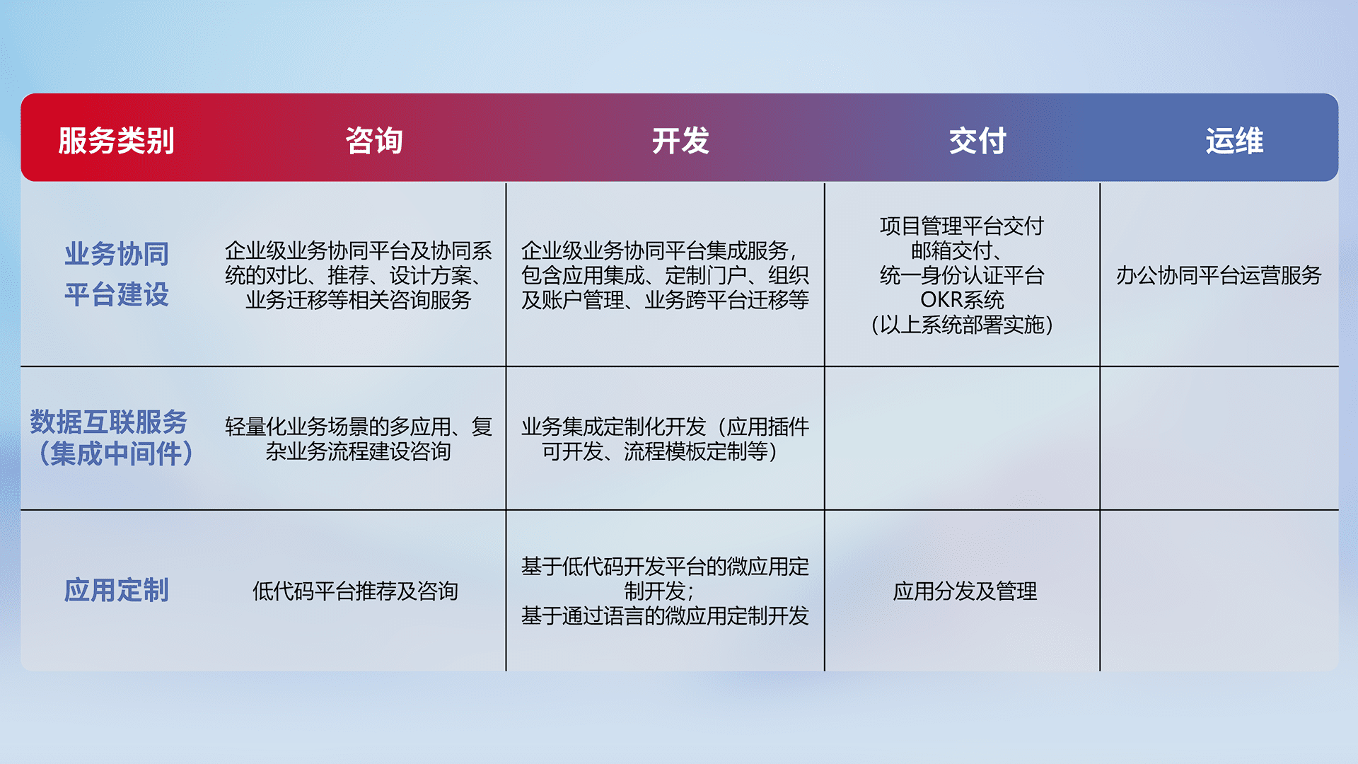 针对钉钉、、企微、、IDaas等平台级产品提供产品的规划、、、方案、、、交付、、定制化开发等服务,,,实现如统一协同办公、、智能客户服务、、、混合会议管理、、、、智能数据查询、、、等业务场景,,实现数字化转型。。